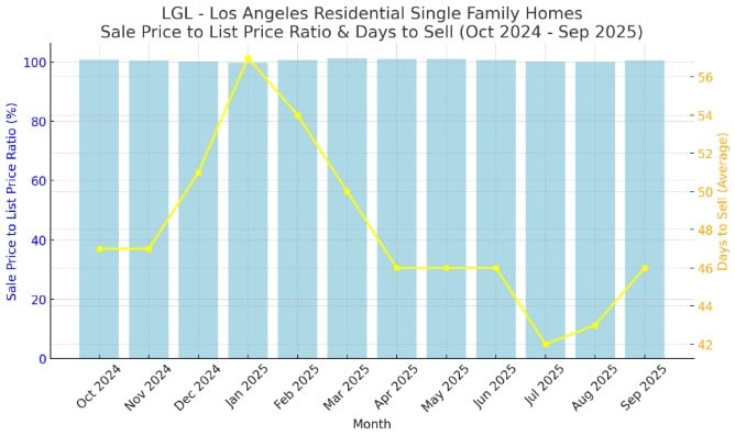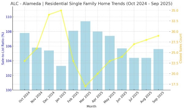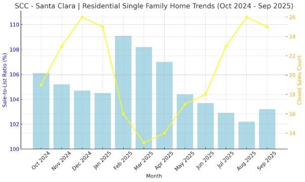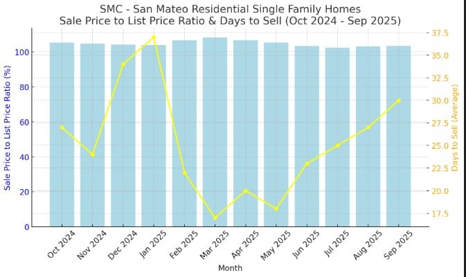 From October 2024 to September 2025, the Residential Single Family Home market in San Mateo County showed a gradual cooling after a strong start to the year. The light blue bars (representing the Sale-to-List Ratio) would range from around 108.2% in March 2025, marking the most competitive month, down to 102.4% in July 2025, the lowest point—indicating that homes sold closer to their asking prices midyear. The yellow line (representing Closed Sales Count) would show peaks in January 2025 (37 sales) and December 2024 (34 sales), suggesting heightened buyer activity during the winter months.